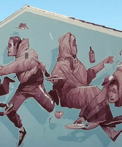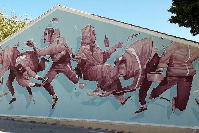 Ce mur fait partie d'une série sur laquelle il travaille depuis plus d'un an. Sa démarche consiste en la réalisation de scènes de personnages en mouvement, inspirée des dynamiques présentes autour du mur dans l’espace public. Les personnages sont inventés sur place, en s'imprégnant du décor et en discutant avec les passants. Ici, l’artiste a imaginé une réunion de quartier, au Tassy, autour d'un thé ou d'un repas, à l'heure où les cultures et les âges se mélangent. La scène entière est en lévitation, ce qui crée un effet de mouvement, presque comme si l’on était dans un rêve.